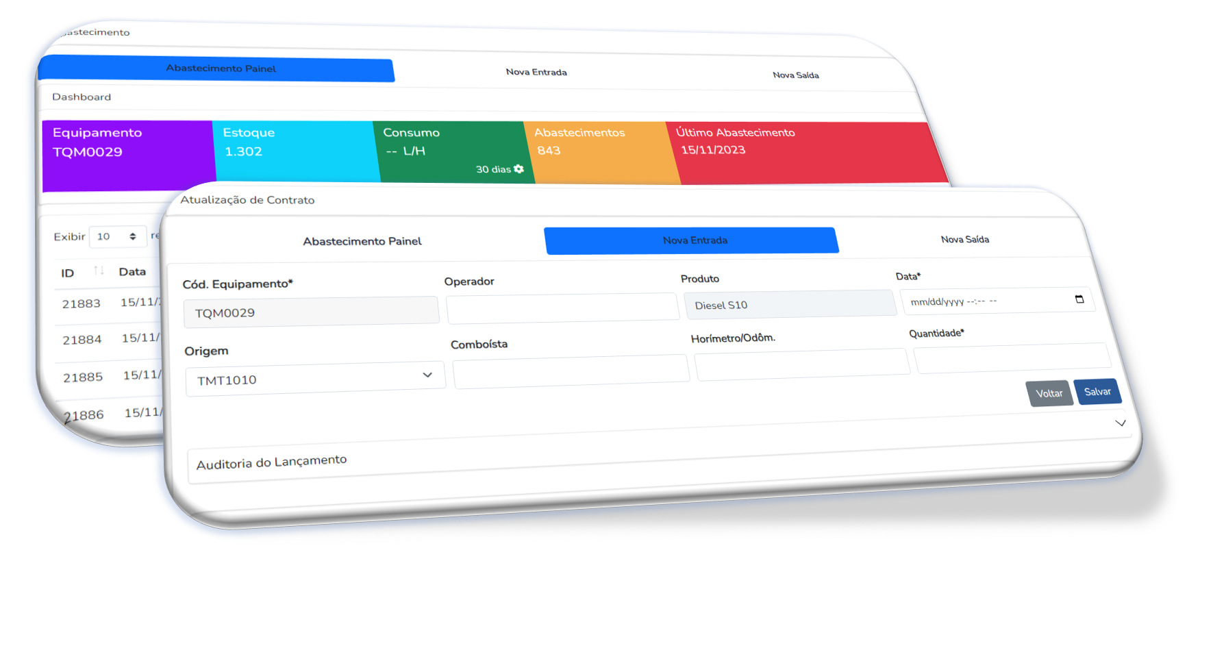 Controle os abastecimentos da sua frota. Lance entradas e saídas nos tanques fixos e comboios, controlando os estoques. Para as máquinas, tenha gestão das entradas de combustível, horímetros e médias de consumo.